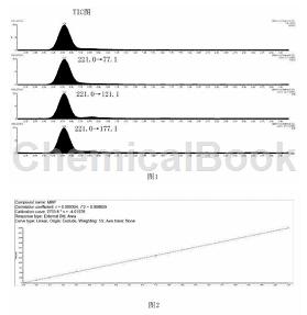 (2)称取1.0g剪碎的样品,装入40ml反应管,加入10ml甲醇,于超声波清洗器中进 行超声萃取,用有机滤膜过滤1ml萃取液至样品瓶中,用超高效液相色谱串联质谱联用仪对 样品溶液进行分析;所述超高效液相色谱串联质谱联用仪参数设置如下:仪器型号, watersacquityhclass+xevotqd超高效液相色谱串联质谱联用仪;色谱柱型号, watersbehc18柱,规格:50mm*2.1mm*1.7um;进样体积,5微升;流速,0.2ml/min;洗脱程序, 40%水+60%乙腈,保持3min;采集模式,负离子mrm模式;毛细管电压,1.5kv;去溶剂气流 速,650l/h;去溶剂气温度,350℃;母离子221.0,锥孔电压30v;子离子77.1、碰撞能量15v,121.1、碰撞能量15v,177.1、碰撞能量10v;定量离子对221.0→77.1;定性离子对221.0→ 121.1、221.0→177.1。