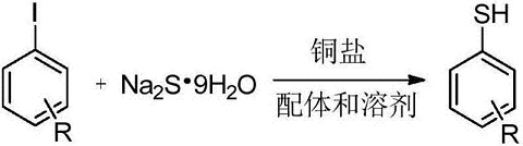 1. 基于九水硫化钠合成硫酚类化合物。具体步骤如下:惰性气体保护下,在非质子极性溶剂中,加入取代碘和巯基化试剂,再依次加入 铜盐催化剂及配体化合物,在90-120℃条件下,反应12-24小时得到反应液,反应液冷却至 室温后,进行酸化处理得到产物。其合成路线如下: