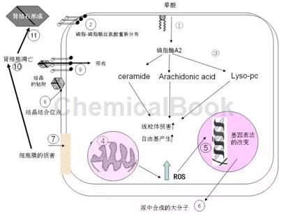在肾细胞中关于草酸盐活性研究中,关注多的磷脂酶a2(cpla2)。cpla2是一种将磷脂sn-2位上的酰基水解的酶,cpla2作用后,可以产生一些活性物质,这些物质包括花生四烯酸、溶血磷脂,它们反过来还可以刺激细胞内的其它信息通道,这种酶还涉及于肾上皮细胞损伤的病理过程。事实上患有结石的患者其血液中的花生四烯酸是增高的,并且红细胞膜上的花生四烯酸也是增高的。有趣的是在肾上皮细胞的培养中cpla2的活性可以决定草酸盐的时间和浓度的关系。cpla2作用后的两种产物aa,溶血磷脂可以调节草酸的活性,引起线粒体功能的改变也可以引起基因的改变。草酸可诱导cpla2的活性,并且对神经酰胺的产生是有一定作用,信号分子贯穿于多种细胞损伤中,从细胞增殖分化到细胞的毒性和死亡,所有三种脂类信号分子在调节草酸盐诱导的肾细胞损伤中起作用。