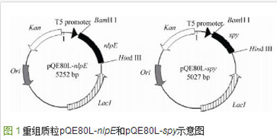 将pcr扩增带有同源臂的nlpe和spy基因片段与通过bamh ⅰ和hind ⅲ两种限制性内切酶双酶切后的pqe80l载体通过一步克隆酶法连接体系(南京诺唯赞生物科技有限公司)连接,构建质粒pqe80l-nlpe和pqe80l-spy(图 1)。一步克隆连接体系为:50–200 ng线性化pqe80l,20–200 ng插入片段,2 μl 5×ce ⅱ buffer,1 μl exnase ⅱ。连接体系置于37 ℃反应30 min,待反应完成后置于冰上冷却5 min,通过化学转化方法将连接产物转入e. coli jm109感受态细胞,并涂布在含有卡那霉素的固体平板。次日通过菌落pcr初步验证平板阳性单菌落,将验证出的阳性转化子测序验证。
