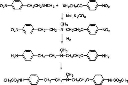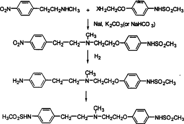 2. 以n-甲基-4-硝基乙胺盐酸盐游离碱为原料,先合成二硝基物,还原后再经甲磺酰化反应,后制得终产品多非利特,反应方程式如下:
