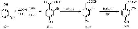 (1) 在碱a的溶液中,以间溴酚(结构式一)和乙醛酸为原料,在一定温度下发生缩合反应;反应完毕后,冷却至室温,用浓盐酸酸化至ph=1,再用洗涤,用萃 取,浓缩,得到2-溴-4-羟基扁桃酸(结构式二);