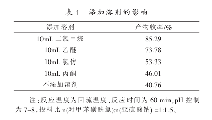 原料对甲基磺酞氯不溶于水,但在水中易发生水解反应;还原剂亚钠不溶于任何有机溶剂,只溶于水。为了减少酞氯的水解反应,添加低沸点有机溶剂溶解对磺酞氯,然后将溶液滴入到亚钠的水溶液中,将低有机溶剂蒸馏,进而反应继续升温,以此方法来取代直接投料。溶剂的选取要求包括:(1)不与酞氯发生反应;2 )对酞氯有一定的溶解性;3)低沸点,容易蒸出回收。下面对二氯甲烷、、氯仿和丙酮四种溶剂以及直接投料进行了实验。