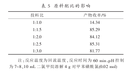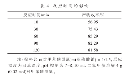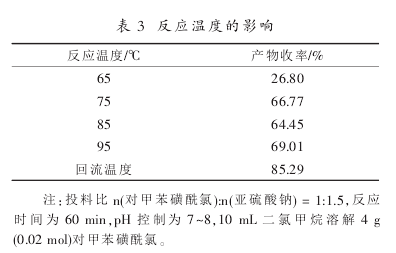 由表5结果分析,对磺酞氯和亚钠的摩尔比为1:1.5时,反应收率达到85.29%,继续加大还原剂的量反应收率基本持平,因而选取。(对磺酞氯):n(亚钠)=1:1.5为佳投料比。