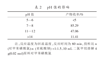 亚钠反应液ph值过低会酸化放出二氧化硫,过高会造成对磺酞氯的水解,所以合适的ph值对反应影响很大。对ph具体考察结果如下表: