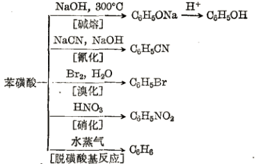 磺酸的磺酸基可被多种基团取代,与氢氧化钠碱熔生成酚钠;与氰化钠反应生成腈;与溴反应生成溴代;与硝酸反应生成硝基;与水共热脱去磺酸基: