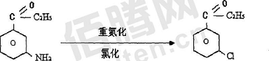 具体操作步骤为:将间氨基酮与适量盐酸加入反应釜中,搅拌冷却至0℃,滴加亚硝酸钠的 水溶液,温度控制在0~5℃,用淀粉碘化钾试纸检测过量的亚硝酸存在,在搅拌状态下,将重氮盐溶液加入到已冷却至0℃,预先配制好的氯化亚铜溶液中,得 粗品3’-氯丙酮,先用盐酸和水分别洗二次,再用5%碳酸钠溶液清洗,后 再用清水洗、干燥、减压蒸馏得产品,其收率为60.5%左右,其含量为90%~95%。