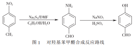 随着对羟基甲醛的用途越来越广,国内外的市场需求量也越来越大,国内外厂商及研究部门对其生产工艺一直进行着长期深入的研究,已有了大量的研究报道。目前国内外报道的生产工艺主要有6种, 其中两种生产工艺值得关注:一种是以对硝基为原料,先进行氧化还原、再进行重氮化反应的两步经典法合成工艺,合成反应路线见图1;另一种是以对酚为原料,在钴、铜化合物混合催化剂作用下,经纯氧氧化合成目标产物的新合成工艺。