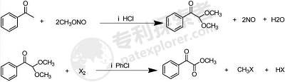 甲酰甲酸甲酯的生产过程中物料比为(重量比):2,2-二甲氧基乙酮: 4-甲基-2,6-二叔丁基酚:卤素=1:0.1:1。2,2-二甲氧基乙酮的生产的反应温度为35-40℃。甲酰甲酸甲酯的生产过程中反应温度为110-120℃。使用乙酮为起始原料,氯化氢气体作为催化剂,与亚硝酸甲酯反应得 到2,2-二甲氧基乙酮,进一步卤代消除反应得到甲酰甲酸甲酯。反应路线与传统的工艺相比,合成的甲酰甲酸甲酯具有价 格便宜,无环境污染的优点,为甲酰甲酸甲酯的工业化生产提供更经济环保的工艺。