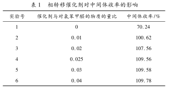 相转移催化剂的加入,使甲硫醇钠水溶液与对氯甲醛不相溶的两相能够更加充分的反应,从表 1 可以看出,随着相转移催化剂的加入中间体的收率逐渐增加,但是当达到一定程度后催化剂量的增加对产品收率并没有促进作用,并且造成后处理困难,成本增加,综合成本考虑催化剂与对氯甲醛的物质的量比为 0. 025∶1 为适宜。