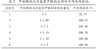 甲硫醇钠与对氯甲醛的比例对中间体的影响: