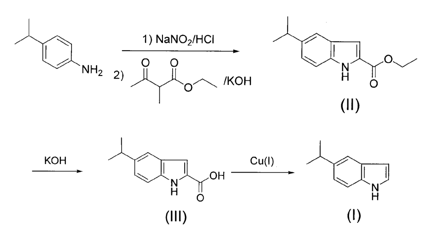 以对异丙基胺为原料,重氮化,与乙基-2-甲基-乙酰乙酯和koh成环反应,得到ii,溶于乙醇后经koh脱脂,粗酸酸化,得到iii,将iii加入高沸点溶剂中,经亚铜盐脱酸,得到5-异丙基吲哚(i)。与现有技术发明相比,该方法得到一种新的吲哚衍生物,5-异丙基吲哚,在药物和生物活性构建方面具有重要作用,与目前制备烷基取代吲哚衍生物相比,合成路线尖端,原料便宜,产率较高,可达60%~70%。
