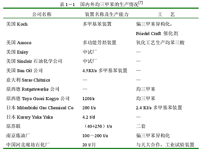 国外对均三的生产,已经工业化的装置多为从重整重芳烃中直接分离。据称日本 mitsubishi gas chemical 公司是世界上大的均三生产商,生产能力 200t/a。国内外均三的生产情况见表 1-1。