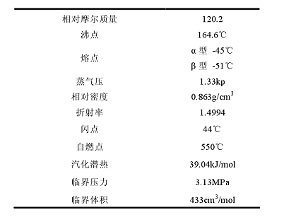 由于均三和邻甲乙沸点差仅有 0.4℃, 相对挥发度为1.009。因此国内外研究者提出了各种分离方法, 主要有以下几种:偏三异构化、重芳烃精馏分离法、萃取精馏法、分子筛吸附分离法、配合分离法 、烷基化分离法、三气相异构化方法(包括偏三气液相异构化 、混三气相异构化)及偏三常压液相烷基化等。由于各种异构体的分离顺序和分离手段不同 ,故各种精制方法之间存在很大的差别 。无色透明液体,不溶于水,溶于乙醇,能以任意比例溶于、、丙酮。均三的物理性质如下:
