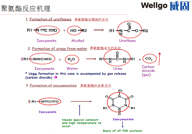 那么,如果出现大气泡的话,主要有两种原因,可能是由于小气泡聚集而成,那么小气泡的形成原因也在上面描述过,第二可能是胶水中混入了水分,异氰酸酯和水反应生产了二氧化碳气体导致出现了胶水发泡现象(反应机理如下图所示),尤其是梅雨季节需要特别注意,要保持环境的干燥程度。若还有其他原因,需要根据具体情况另行分析。