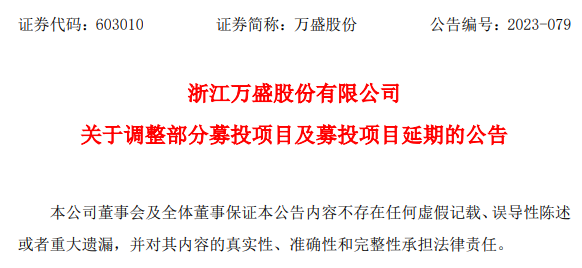 12月1日,万盛股份发布浙江万盛股份有限公司关于调整部分募投项目及募投项目延期的公告。