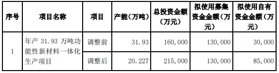 本次募投项目调整及追加投资情况:年产31.93万吨功能性新材料一体化生产项目原计划总投资额为16亿元,