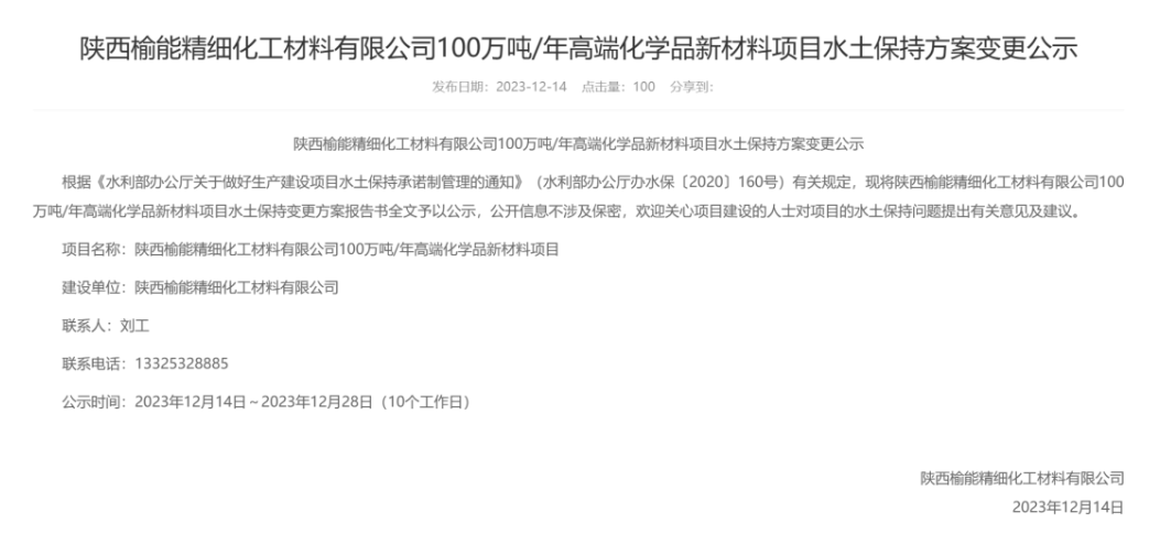 12月14日,陕西榆林能源集团有限公司官网发布公告,将陕西榆能精细化工材料有限公司100万吨/年高端化学品新材料项目水土保持变更方案报告书全文予以公示,公开信息不涉及保密,欢迎关心项目建设的人士对项目的水土保持问题提出有关意见及建议。