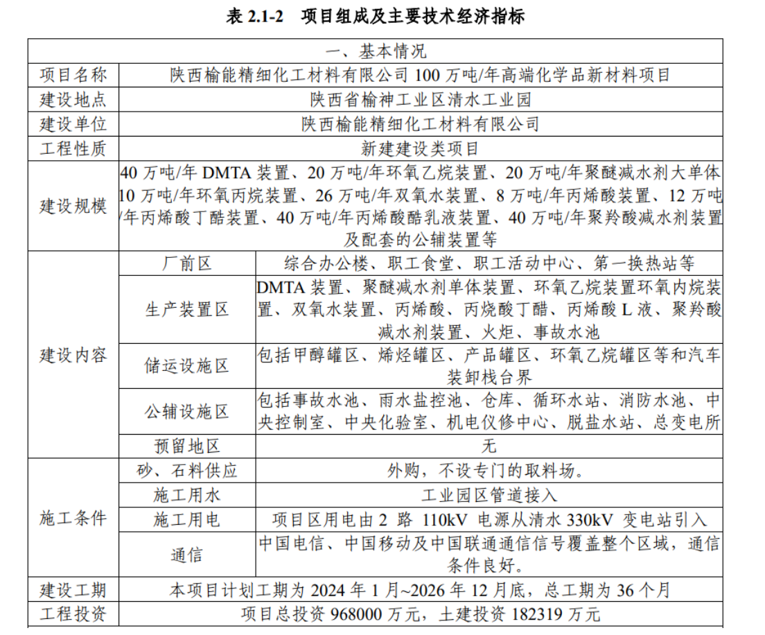 建设规模及内容:项目建设内容主要包括40万吨/年dmta装置、20万吨/年环氧乙烷装置、20万吨/年聚醚减水剂大单体、10万吨/年环氧丙烷装置、26万吨/年双氧水装置、8万吨/年丙烯酸装置、12万吨/年丙烯酸丁酯装置、40万吨/年丙烯酸酯乳液装置、40万吨/年聚羧酸减水剂装置及配套的公辅装置等。
