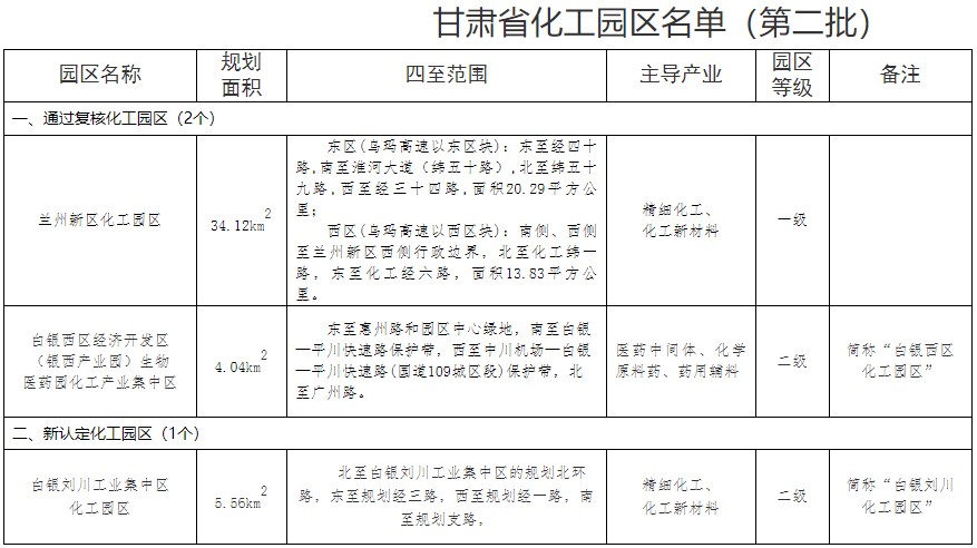 按照《甘肃省化工园区建设标准和认定管理办法(试行)》,2023年11月27日至29日,省工信厅会同省应急厅、省生态环境厅、省自然资源厅、省水利厅、省公安厅、省住建厅、省交通厅,邀请行业专家组成专家组,对兰州新区化工园区、白银西区经济开发区(银西产业园)生物医药园化工产业集中区进行了复核,对白银刘川工业集中区化工园区进行了认定。现将通过复核和拟认定的化工园区名单予以公示,公示时间:2023年12月15日至28日,共10个工作日,欢迎社会公众进行监督。联系电话:0931-8929291