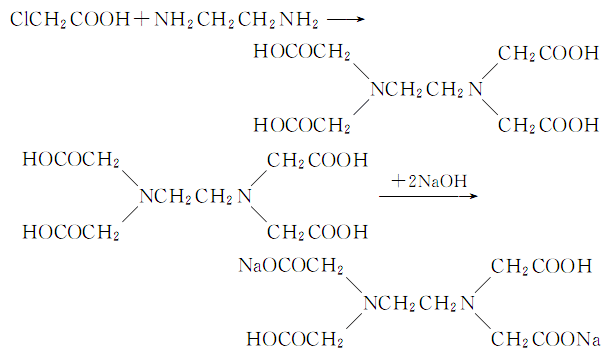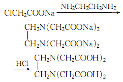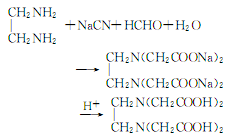 4.乙二胺与甲醛,氰化钠反应 将60%的乙二胺水溶液,30%氰化钠水溶液和氢氧化钠混合,保持在20℃混合0.5h 。然后滴加甲醛水溶液。反应后减压蒸出水。然后重复上述操作,后一次加入过量的甲醛,使氰化钠完全反应。用稀酸调ph值至1.2。析出白色沉淀,过滤,水洗,110℃干燥。得产品。反应式如下: