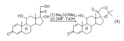 丙酮化合物的形成 2,2-二甲氧基丙烷作为保护基团有很大的优势。在酸催化交换反应中,氢化泼尼松侧链17a,21-二醇基与2,2-二甲氧基丙烷发生环缩醛反应,生成17a,21-二亚异丙基二氧孕烷,有很好的产率 (式4)[2]。二亚异丙基二氧基官能团对碱稳定。