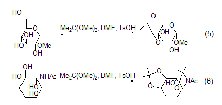 异亚丙基衍生物 2,2-二甲氧基丙烷可用于羟基的保护,2,2-二甲氧基丙烷、dmf和催化量的对磺酸的混合物是一个有效的丙酮酸酯保护剂,能够保护顺式-邻二平伏羟基。甲基α-d-吡喃糖在上述条件下反应,生成甲基4,6-o-亚异丙基-α-d-吡喃糖。脱氧肌醇胺用相同的混合试剂处理,则主要生成二亚异丙基衍生物 (式5,式6)[3]。