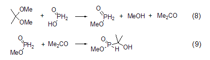 形成次磷酸甲酯 次磷酸甲酯可通过次磷酸与2,2-二甲氧基丙烷反应制得。然而,此产物会进一步与生成的丙酮反应,生成1-羟基-1,1-二甲基亚膦酸甲酯 (式8,式9)[6]。