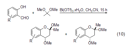 形成并吡喃 用铋化合物催化2,2-二甲氧基丙烷的反应是近来研究的热点,铋化合物被认为是无毒和绿色的。例如用bi(otf)3·xh2o (1<x<4) (0.1 mol%) 催化2,2-二甲氧基丙烷与一系列取代的水杨醛反应,生成对应的有取代基的2,2-二氢-1h-并吡喃 (式10)[8]。