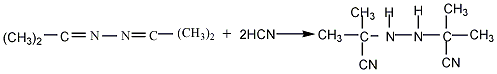 6.由水合肼与丙酮于回流温度下进行缩合反应生成嗪(丙酮连氮)。由70%的与25%~30%的氰化钠反应,制得氰化氢气。然后将得到的氰化氢气与嗪(丙酮连氮)于55~60℃下反应,之后冷却降温继续反应得到二异丁腈肼。二异丁腈肼与氮气在20℃以下反应,然后静置沉降、过滤,滤液回收利用,滤饼用水洗涤,分去水后,获精品偶氮二异丁腈。用乙醇将偶氮二异丁腈粗品溶解、过滤,滤液经低温结晶,吸滤,低温干燥,即得成品。