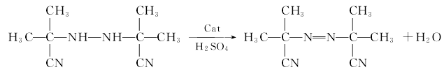 氧化反应 将缩合反应所得二异丁腈肼、氧化介质即98%的与氧化反应的废酸、催化剂加入氧化器中搅拌,在1.5h内匀速将废酸与氯酸钠或氯酸钾配制的氧化剂溶液滴加到氧化器中,保持温度为25~30℃,继续反应0.5h。之后将反应物经过滤器过滤,清水洗涤两次,结晶即为aibn。氧化应式如下: