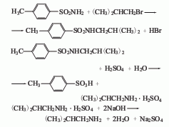3.以溴代异丁烷与对磺酰胺为原料,经缩合、水解而得。先将对磺酰胺、溴代异丁烷、乙醇碱液一起回流4h,回收乙醇至出现结晶,再用盐酸中和,则析出大量淡黄色结晶,过滤,水洗得缩合物。将缩合物、和水混合加热回流10h后,改为蒸馏装置,加40%液碱调至碱性,随后减压蒸出粗胺,再粗馏收集66.8-68.8℃馏分即为成品。
