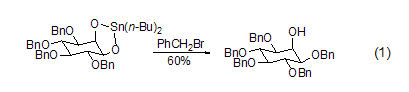 苄基化反应在糖类化合物中的应用非常成功。首先将糖类衍生物用锡试剂预处理,然后发生苄基化反应,这样可以在轴向羟基存在下选择性地实现平伏羟基的保护 (式1)[3]