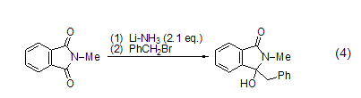 苄溴倾向于与有机金属化合物如烷基锂、格氏试剂、烷基酮等发生偶联反应。如苄溴与n-甲基邻二甲酰亚胺在li的作用下发生的偶联反应 (式4)[9]