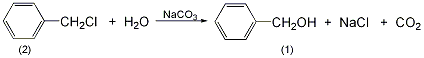 于装有搅拌器、回流冷凝器、温度计的反应瓶中,加入水250ml,碳酸钠56g,氯化苄(2)63.3g(0.5mol),剧烈搅拌以使氯化苄乳化。加入至微沸(约95℃)。反应中有二氧化碳生成。二氧化碳气泡停止逸出时说明反应结束,而后再搅拌反应0.5h。冷却,分出有机层,水洗,得粗品苄基醇。分馏,收集204~205℃的馏分,得苄基醇①(1)40g,收率74%。[1]