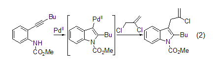 钯偶合反应  在钯催化下,炔基胺和烯丙基氯的环化反应可以高产率地生成3-烯丙基吲哚 (式2)[3]。反应混合物中一定要有质子脱除剂,这样可以避免有机钯的中间体被h+抑制。