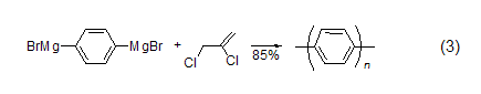 芳基偶合反应  在芳基格氏试剂自由基偶合反应中,2,3-二氯丙烯是电子受体。使用2,3-二氯丙烯和双官能团的芳基格氏试剂可生成聚对烯 (ppp) (式3)[4]