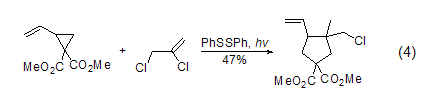 自由基反应  带有官能团的环戊烷可由乙烯基环丙烷和三取代丙烯通过光化学和dbu引发的方法制备 (式4)[5]