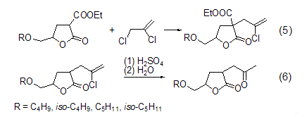 β-氯烷基内酯可通过4-烷氧基甲基-2-乙氧基羰基丁醇化合物与2,3-二氯丙烯发生烷基化反应后,水解并脱羧基得到,而此内酯为2-丙酮基-4-烷氧基甲基丁醇化合物的合成提供了一条新的路径 (式5,式6)[6]