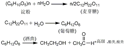 1. 发酵法:将富含淀粉的农产品如谷类、薯类等或野生植物果实经水洗、粉碎后,进行加压蒸煮,使淀粉糊化,再加入适量的水,冷却至60℃左右加入淀粉酶,使淀粉依次水解为麦芽糖和葡萄糖。然后加入酶母菌进行发酵制得乙醇。