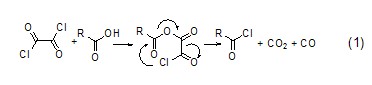 与亚硫酰氯相似,草酰氯与酸作用会给出气体副产物,生成的氯化物能很容易分离出来 (式1)[1]。