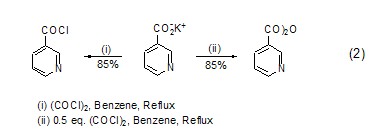 草酰氯与羧酸根离子的作用机理包括亲核取代、分子内电荷转移,从而形成相应的酰氯产物。通过调整草酰氯与羧酸根离子的比例还可以得到酸酐化合物 (式2)[2]。
