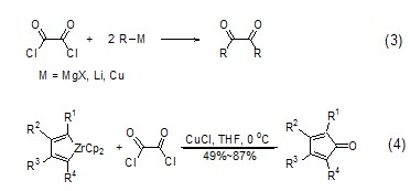 草酰氯与金属有机化合物如格氏试剂,烷基锂作用生成邻二羰基化合物 (式3)[3]。草酰氯与锆杂环戊二烯在cucl的作用下生成环戊二烯酮衍生物 (式4)[4]。