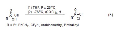 草酰氯能用于制备磷酰氯衍生物,如磷酸在草酰氯和吡啶作用下在低温能高产率地转换为相应的磷酰氯 (式5)[5]。