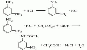 1、间二胺酰化法     由间二胺酰化而得。向反应锅中加入水及间二胺,使溶解。再加入30%盐酸,搅拌半小时,然后加入,控制反应温度在40℃,保温搅拌1h,加入精盐盐析,过滤。经中和得间氨基乙酰胺。酰化操作也可能采用乙酐作为原料。原料消耗定额间二胺1021kg/t、乙酐1013kg/t、盐酸475kg/t。
