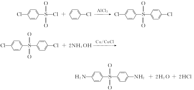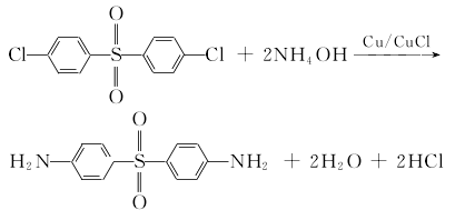 将4,4′-二氯二砜、酮粉,氯化亚酮及氨水加入高压釜,搅拌下加热,于170~202℃及3mpa压力下,反应14h,然后降温至60℃,经过滤、水洗、干燥得粗产品4,4′-二氨基二砜。根据产品的用途,对粗产品进行精制。例如可将粗产品溶解于10%的盐酸中,加活性炭脱色,过滤,冷却至10℃以下,用碳酸钠溶液调节ph值至2~2.5,离心过滤,再水洗至中性,经干燥即得成品。收率78%以上。