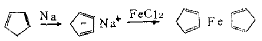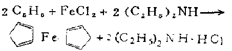 在通氮下,将上述含有氯化亚铁的250毫升烧瓶中的物料加到冷却的环戊二烯基钠溶液中,在刚低于回流温度下搅拌反应1.25小时。蒸除溶剂,从残余物中用几份热石油醚以萃取出二茂铁,蒸出石油醚即得产品。二茂铁可采用从戊烷或环已环中重结晶,或采用升华法以纯制。得到31-34克(67一73%).