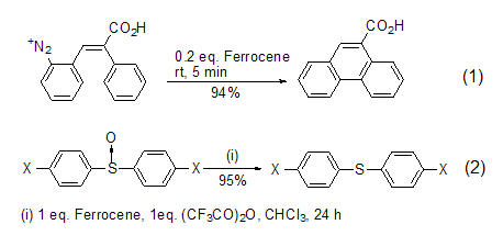 二茂铁本身是一个很好的还原剂,能够参与很多氧化还原性质的反应,例如:它可以作为一种单电子的均相催化剂催化pschorr环化反应,使本来需要数小时的反应在几分钟之内完成,且得到较高的产率 (式1)[1],它还能在三氟酐存在下将亚砜还原为硫化物 (式2)[2]。
