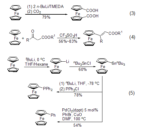 通过对二茂铁的环戊二烯环的活化,能够制得一系列衍生物 (式3[3],式4[4],式5[5] ),其中一些具有平面手性的衍生物能够作为手性配体与其它金属配合形成手性催化剂,已经实现的反应如不对称的diels-alder反应[6,7],不对称的烯丙基化反应[8,9],及其它一些不对称官能团化反应[10]。