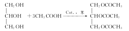 1、由甘油与酯化而得。将甘油预热到50-60℃后,加入、和。加热搅拌回流脱水,脱水完后回收,再加入乙酐,加热4h。冷却后用5%碳酸钠中和ph至7,分去水层,粗油用氯化钙干燥。减压蒸馏,收集128-131℃(0.93kpa)馏分,即为甘油三酯。2、由醋酐与热甘油酯化后经真空蒸馏提纯而得。3.酯化反应 向塔釜中分别加入一定量的甘油、冰醋酸(醇酸摩尔比为1∶4)、固载型杂多酸催化剂(醇质量的2.5%)和带水剂(温度调节剂),加热塔釜液,使釜液处于微沸或沸腾状态下,进行反应精馏操作。塔顶分水器中的酯相返回精馏塔,水相采出。当塔顶分水器无水滴分出时,向塔釜中加入一定量的醋酐,继续反应4h后,终止酯化反应,冷却后,即得粗酯。